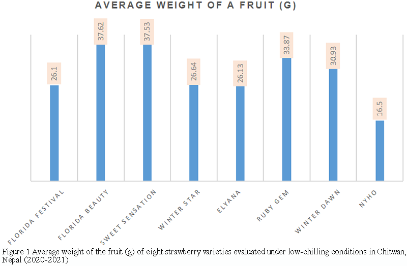 ![]() Figure 1 Average weight of the fruit (g) of eight strawberry varieties evaluated under low-chilling conditions in Chitwan, Nepal (2020-2021) |