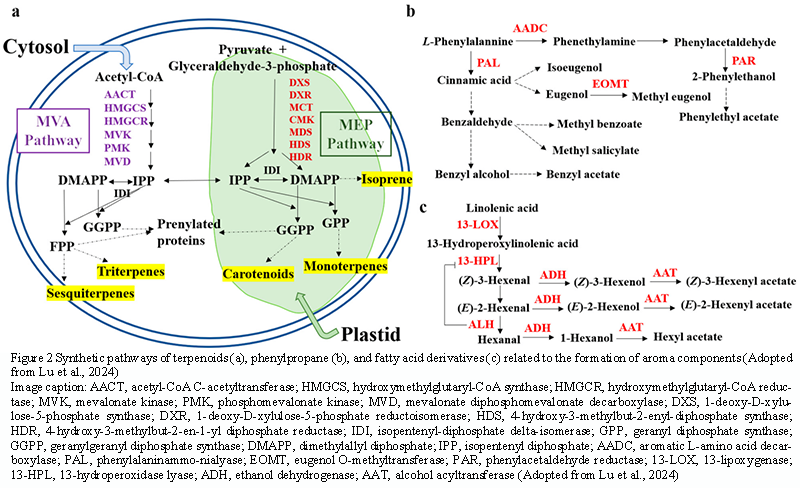 Figure 2 Synthetic pathways of terpenoids (a), phenylpropane (b), and fatty acid derivatives (c) related to the formation of aroma components (Adopted from Lu et al., 2024) Image caption: AACT, acetyl-CoA C-acetyltransferase; HMGCS, hydroxymethylglutaryl-CoA synthase; HMGCR, hydroxymethylglutaryl-CoA reductase; MVK, mevalonate kinase; PMK, phosphomevalonate kinase; MVD, mevalonate diphosphomevalonate decarboxylase; DXS, 1-deoxy-D-xylulose-5-phosphate synthase; DXR, 1-deoxy-D-xylulose-5-phosphate reductoisomerase; HDS, 4-hydroxy-3-methylbut-2-enyl-diphosphate synthase; HDR, 4-hydroxy-3-methylbut-2-en-1-yl diphosphate reductase; IDI, isopentenyl-diphosphate delta-isomerase; GPP, geranyl diphosphate synthase; GGPP, geranylgeranyl diphosphate synthase; DMAPP, dimethylallyl diphosphate; IPP, isopentenyl diphosphate; AADC, aromatic L-amino acid decarboxylase; PAL, phenylalaninammo-nialyase; EOMT, eugenol O-methyltransferase; PAR, phenylacetaldehyde reductase; 13-LOX, 13-lipoxygenase; 13-HPL, 13-hydroperoxidase lyase; ADH, ethanol dehydrogenase; AAT, alcohol acyltransferase (Adopted from Lu et al., 2024) |
