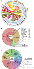 Figure 1 Characterization of the D. zibethinus genome (Adopted from Teh et al., 2017) Image caption: (a) Circos plot of the multidimensional topography of the D. zibethinus genome (right), comprising 30 pseudomolecules that cover~95% of the assembly. Concentric circles, from outermost to innermost, show (1) gene density, (2) repeat element density, (3) GC content, and (4) syntenic regions with T. cacao (left), the closest sequenced relative in the Malvaceae family that did not undergo a recent WGD event. (b) Distribution of repeat classes in the durian genome. (c) Distribution of predicted genes among different high-level Gene Ontology (GO) biological process terms (Adopted from Teh et al., 2017) |