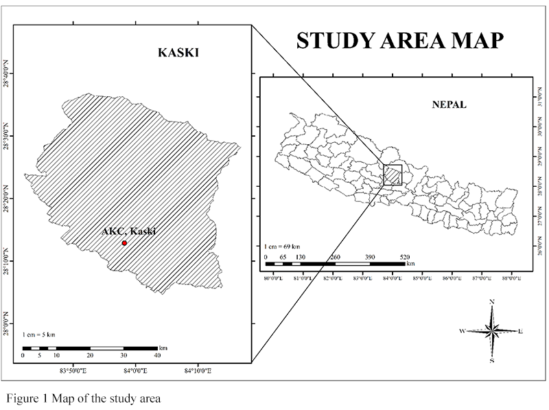 The experiment was conducted at Birauta-17, Pokhara, Kaski, in a naturally ventilated plastic greenhouse. The site's geographical location was 28° 12' 47.693'' N latitude and 83° 58' 16.596'' E longitude with an elevation of 800 m above sea level (Figure 1). The average temperature and relative humidity inside the greenhouse during the study period were approximately 28 °C to 35 °C and 70% to 80%, respectively.