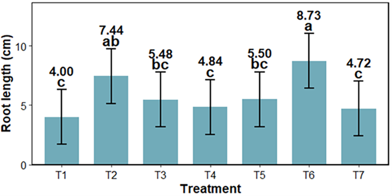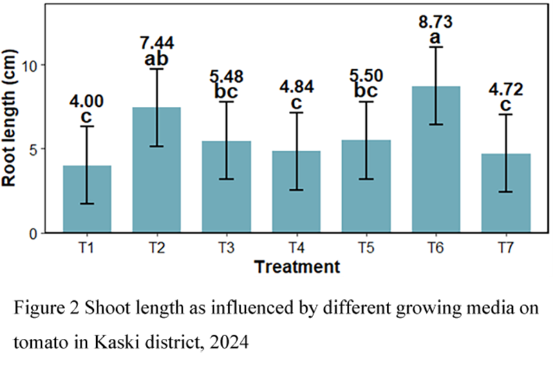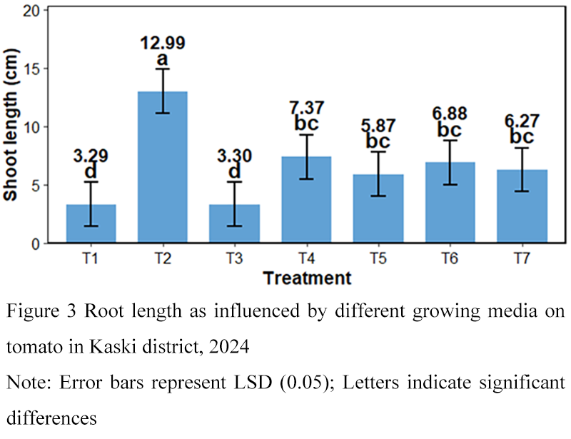 Figure 3 Root length as influenced by different growing media on tomato in Kaski district, 2024 Note: Error bars represent LSD (0.05); Letters indicate significant differences |