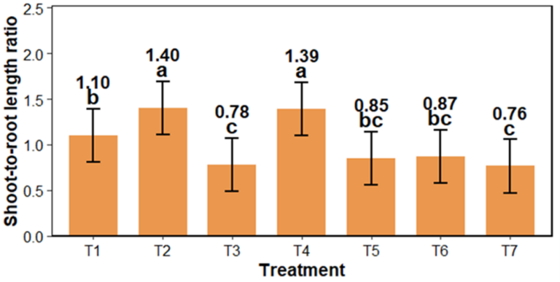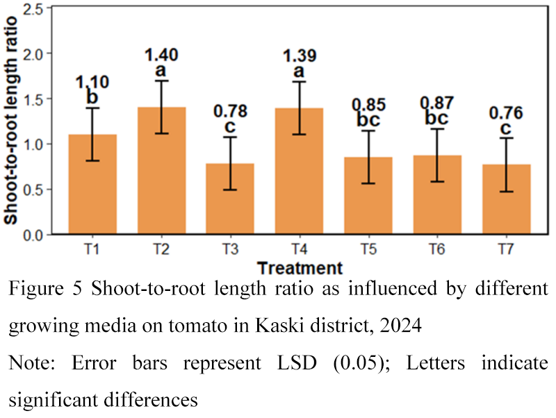 Figure 5 Shoot-to-root length ratio as influenced by different growing media on tomato in Kaski district, 2024 Note: Error bars represent LSD (0.05); Letters indicate significant differences |