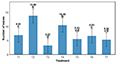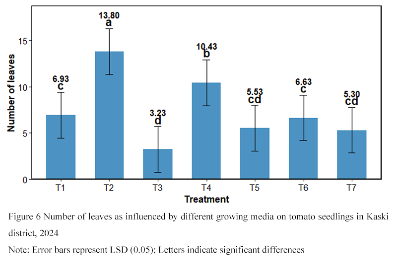 Figure 6 Number of leaves as influenced by different growing media on tomato seedlings in Kaski district, 2024 Note: Error bars represent LSD (0.05); Letters indicate significant differences |