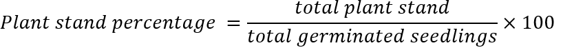 Finally, the plant stand percentage was calculated by observing the number of seedlings that remained viable 24 days after sowing. The percentage was derived using the formula: