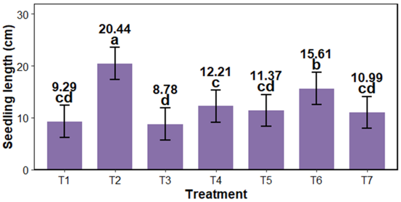 Different growing media treatments had a significant effect on seedling shoot length, root length, shoot-to-root length ratio, and total seedling length (Figure 2; Figure 3; Figure 4; Figure 5). The highest shoot length (12.99 cm) was observed in T2 (cocopeat + vermicompost), while the shortest (3.29 cm) was recorded in the control (T1). For root length, T6 (soil + cocopeat, 8.73 cm) and T2 (7.44 cm) performed best. The highest shoot-to-root ratio (1.40) was also recorded in T2, statistically at par with T4 (1.39). T2 exhibited the maximum seedling length (20.44 cm), whereas T3 (cocopeat + perlite) and T1 had the lowest values.