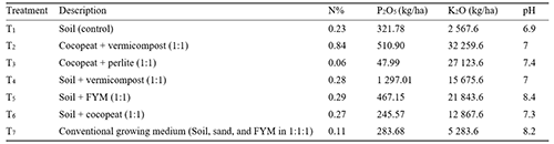 The experiment was laid out in a Completely Randomized Design (CRD), with three replications. Seven treatments of growing media i.e., T1 - soil (control), T2 - cocopeat + vermicompost (1:1), T3 - cocopeat + perlite (1:1), T4 - soil + vermicompost (1:1), T5 - soil + FYM (1:1), T6 - soil + cocopeat (1:1), and T7 - conventional growing medium (soil, sand, and FYM in 1:1:1) were tested (Table 1).