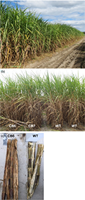 Figure 1 (a) Field trial of TALEN-mediated COMT mutants. (b) Field performance of COMT mutant lines and wild type (WT). CB6 and CB7 are mutant lines derived through direct embryogenesis and biolistic transformation. (c) Stems of field-grown TALEN-mediated COMT mutant (CB6) in comparison with wild type (WT), immediately after juice extraction with roller mills (Adopted from Kannan et al., 2018) |