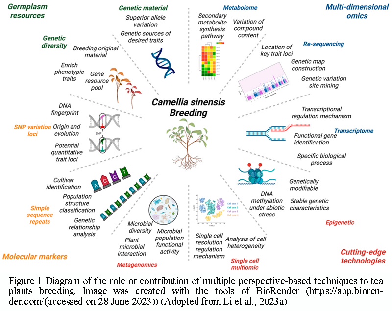 ![]() Figure 1 Diagram of the role or contribution of multiple perspective-based techniques to tea plants breeding. lmage was created with the tools of BioRender (https://app.biorender.com/(accessed on 28 June 2023)) (Adopted from Li et al., 2023a) |